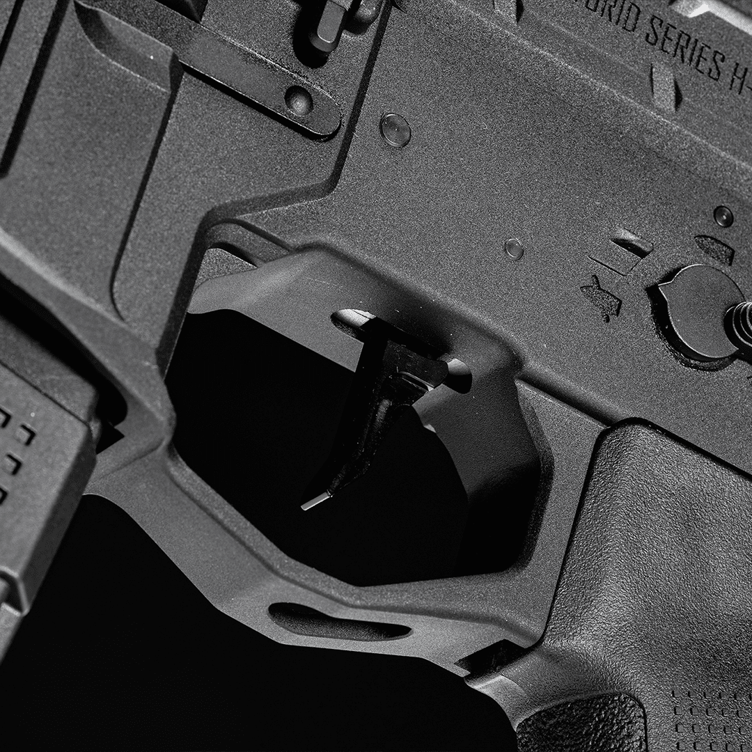 Inside, it comes with all the great internals of the EVO with some amazing parts of its own. This includes an electronic trigger unit with integrated Mosfet, which allows the user to program the replica’s firing modes. This airsoft rifle has four distinct modes: safe, single fire, burst fire and full auto. The ECU also provides cycle detection with smart, self-adjusting Active Break and pre-cocking. It also includes a quick-change spring guide, accessible through the buffertube, a rotary hop-up unit and a T-plug battery connector. These components deliver the tried, tested and beloved performance of the EVO with the stunning new body of an AR, thereby putting the Hybrid in H-15.