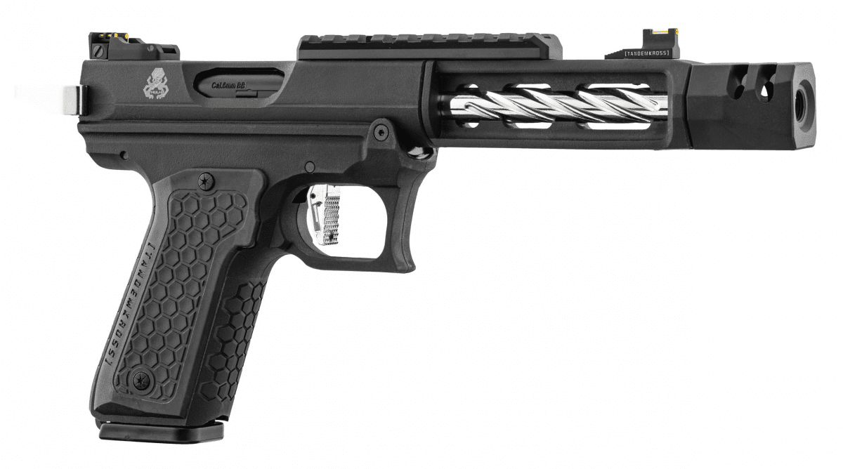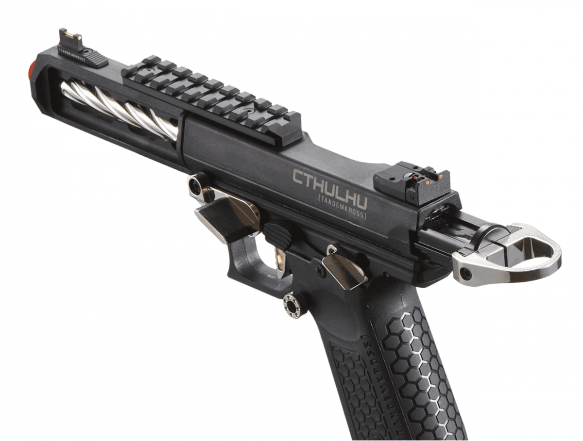 Introducing the new Tandemkross CTHULHU gas pistol. Made from reinforced polymer, this semi/full auto GBB features a fully licensed design. This replica features an innovative "Game Changer Pro" square compensator, a CNC thumb rest, and a "skeleton" trigger. Additionally, the Tandemkross Hivegrip ensures a solid grip. With a "Halo" loading ring and "Eagle Eye" fiber optic sights, this pistol offers unmatched accuracy. The 24-round magazine and adjustable hop-up enhance its versatility.