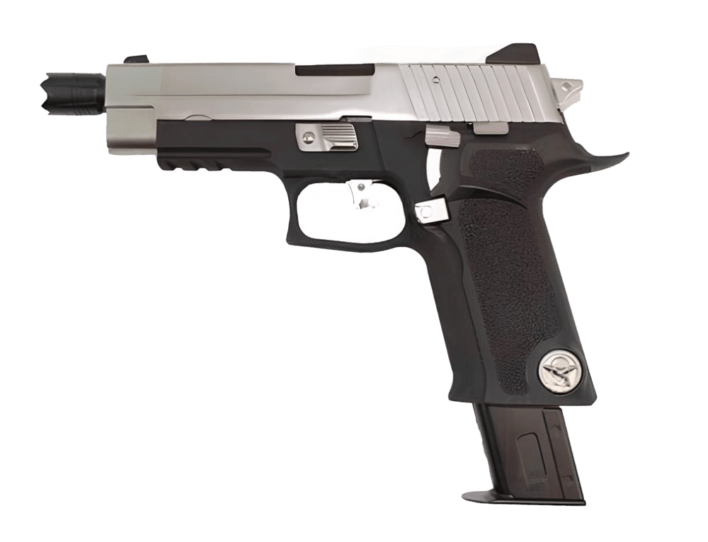 WE Virus Biohazard Sig P226 GBB Pistol - Chrome is a Gas Blowback Airsoft Pistol Based on the Sig P226, styled towards the video game series Resident Evil. The pistol features a strong blowback action with a Silver colored slide and extended magazine. The pistol is highly durable with a Polymer pistol grip and an Alloy Slide. The weapon features a decocking lever and custom flash hider. The weapon comes with an extended magazine and is great for those who want a unique pistol with a great kick.