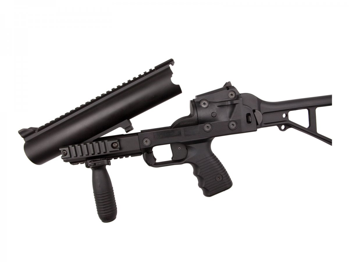 A quick-remove front grip is supplied to make the GL-06 complete. The GL-06 launcher takes all 40mm gas/Co2 Airsoft and paintball grenades, and is cross compatible with different brands of 40mm grenades
