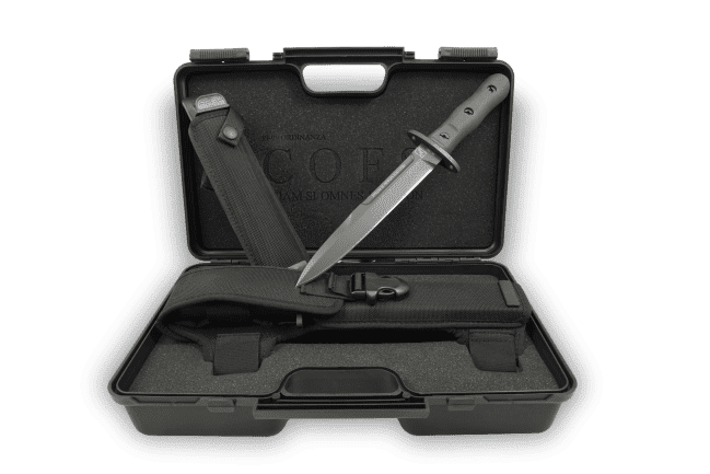 The result of a project sponsored by COFS (the inter-force operations command for Italian special forces) and its former Commander-in-chief, Gen. Bertolini – not to mention advocated for by knife collectors worldwide – this 39-09 combat knife is a restyling of the Model 1939 “paracadutista assaltatore” (assault paratrooper) knife, a celebrated piece of Italian military history. While preserving the original shape, structure and proportions, we managed to reinforce, add increased functionality and manufacture this combat knife to contemporary military specifications from up-to-date materials. Small changes which make it a highly effective, dependable dagger. The included hard sheath is designed to be worn at the ankle, in the characteristic fashion of Italian paratroopers. The version 39-09 ORDINANZA is black oxide-coated with COFS logo & motto. It comes in ABS engraved case with an ankle sheath and a parade belt sheath.