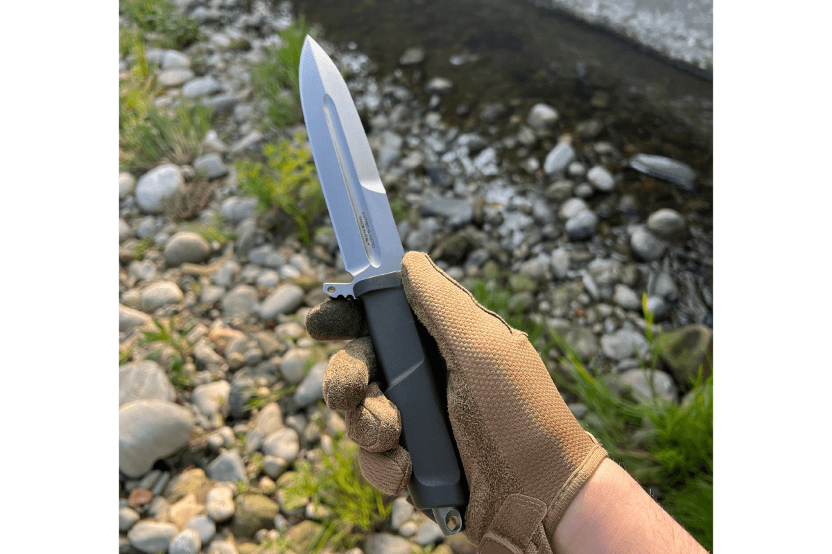 The first of a new line of multipurpose knives. The blade is made in Böhler N690 steel with a hardness of 58 HRC and a chemical burnishing coating for the Black version. All other colours in production have got a blade with Stone Washed finishing. The handle is still in forprene . It is no more assembled by the side screws but thanks to the shank in truncated cone-shaped stainless steel that is screwed to the bottom and goes to fit inside a special seat, which makes it solid. In this way the knife is well balanced. The sheath is minimalist; most of the fabric has been cut off; it has got a 2nd level retention system, remembering the style of the model it was inspired by.