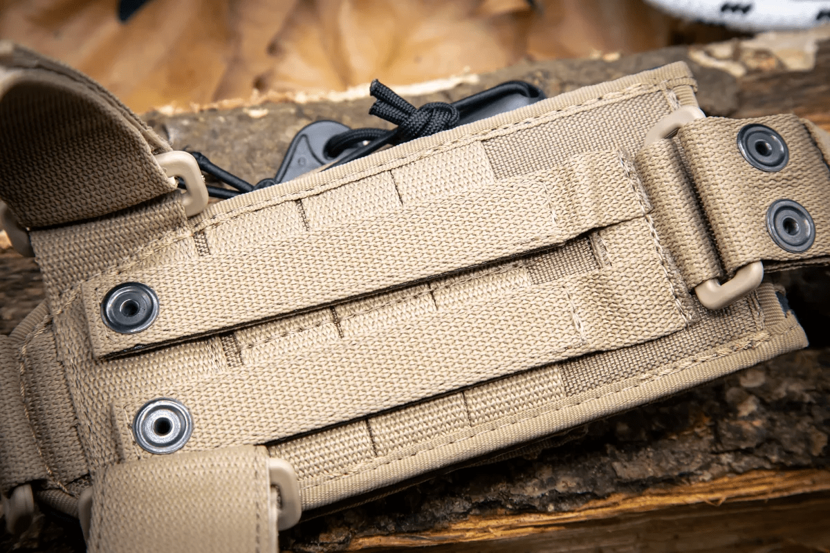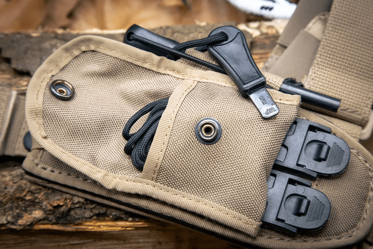 Comes with a desert Cordura sheath with M.O.L.L.E. system webbings, a mini pouch containing a paracord with flammable filament, which can be used in case of emergency and/or difficult climatic conditions, and a flint for lighting fires.