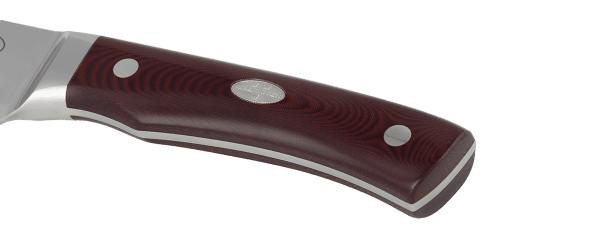 CMT (Character, Morse, Telephony) stands out as one of the most exclusive series of chef’s knives ever made. With more than thirty years of experience in knife steel technology, we have chosen to use a laminate cobalt steel. It’s a steel which has proven to be both strong and stay sharp very well. On top of that we add a convex edge which is both sharp and strong, also a result of our long experience of knives. In order to get a tight and hygienic joint between the cross-guard and the blade we weld the guard to the tang with a special electrode and then grind a sleek profile. To this we add an exceptionally beautiful maroon micarta to ensure a handle that will last as long as the blade. It’s obvious that these knives are entirely made by hand – no machine can produce such fine made knives!