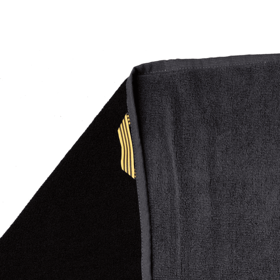 THIS GLOCK BATH TOWEL IN GREY AND BLACK.
