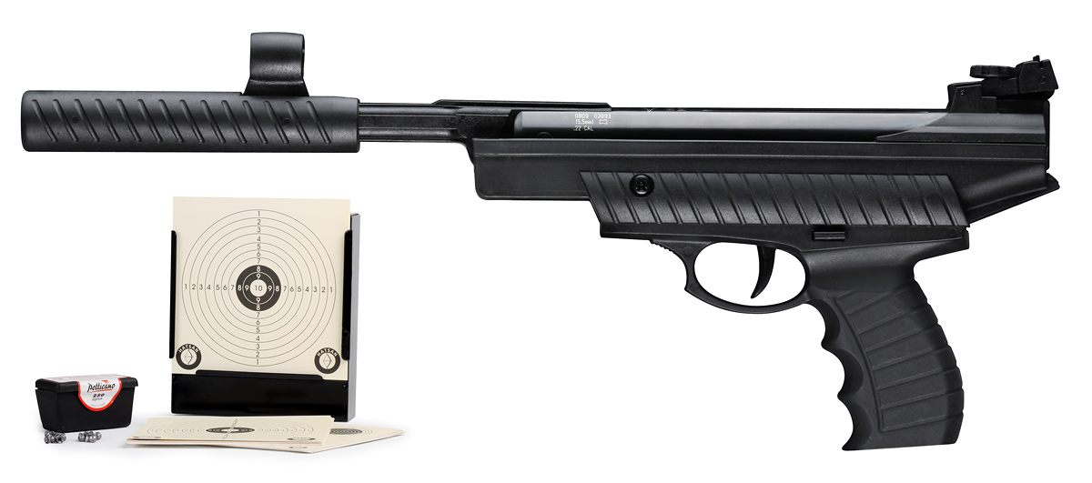 Hatsan 25 kit har allt man behöver för att börja skjuta luftpistol. Komplett med ammunition, kulfång och tavlor. Pistolen är robust konstruerad och enkel att använda. Den laddas genom att man bryter pipan och den medföljande pipförlängaren gör att det krävs avsevärt mindre muskelkraft vid laddning. Pipan är räfflad och ska laddas med diabolokulor i kaliber 5,5mm (.22") Pistolen har hög effekt och för att reducera rekylen är pistolen försedd med ett rekyldämpande system som förbättrar precisionen. Frästa 9-11mm kilspår gör det enkelt att utrusta pistolen med kikar- eller rödpunktsikte.