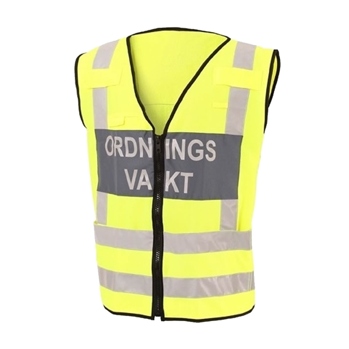 Varselväst eller så kallad reflexväst av hög kvalité för dig som jobbar som ordningsvakt. Godkänd enligt ordningsvakt FAP:en och följer exakt RPS krav och föreskrifter. Detta är modellen i standard utförande.