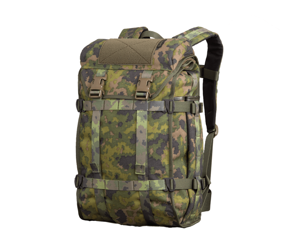 A seriously sensible, utterly functional and rugged all-around combat/daypack, made to meet the diverse carrying needs of the regular soldier. Total capacity with side pouches filled ca. 30 litres, with many external attachment points for additional gear.