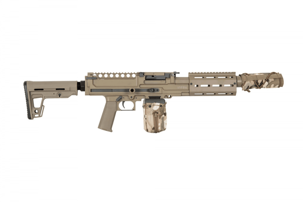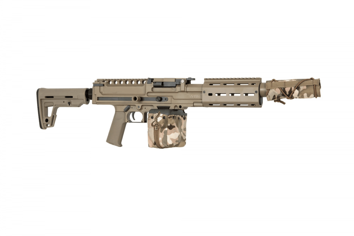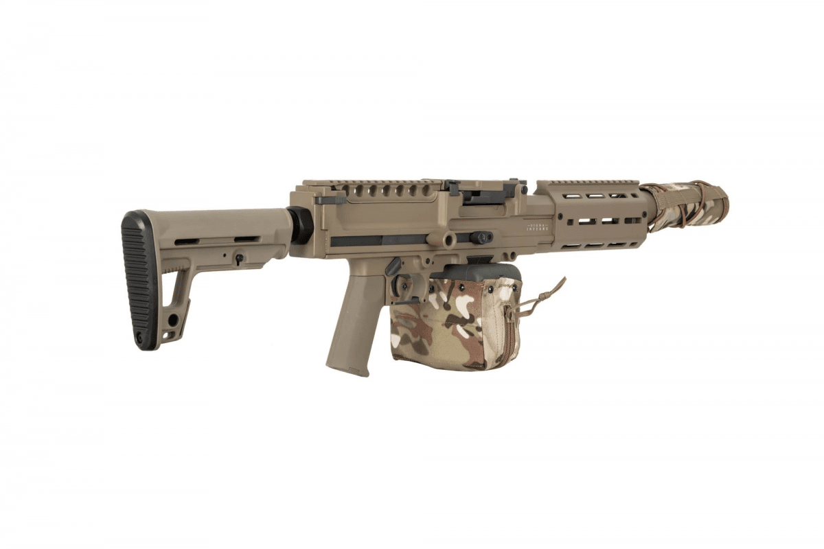 | Magazine | Electric 1200 rds. Magnetic drum (avoids the problem of wires) and allows through its selector to adapt the power speed of the bbs according to the type of battery used or any upgrades made by the user. It is advisable to use AQUILA with 11.1V batteries and in position 1 of the drum selector. |