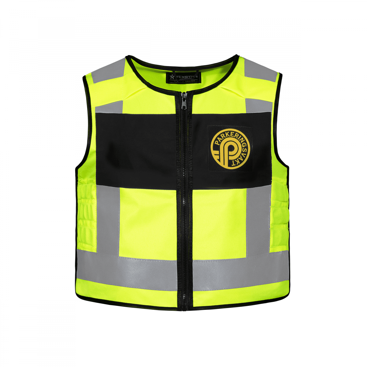 Gul slimmad varselväst för parkeringsvakt. Monofonhållare, svart platta.