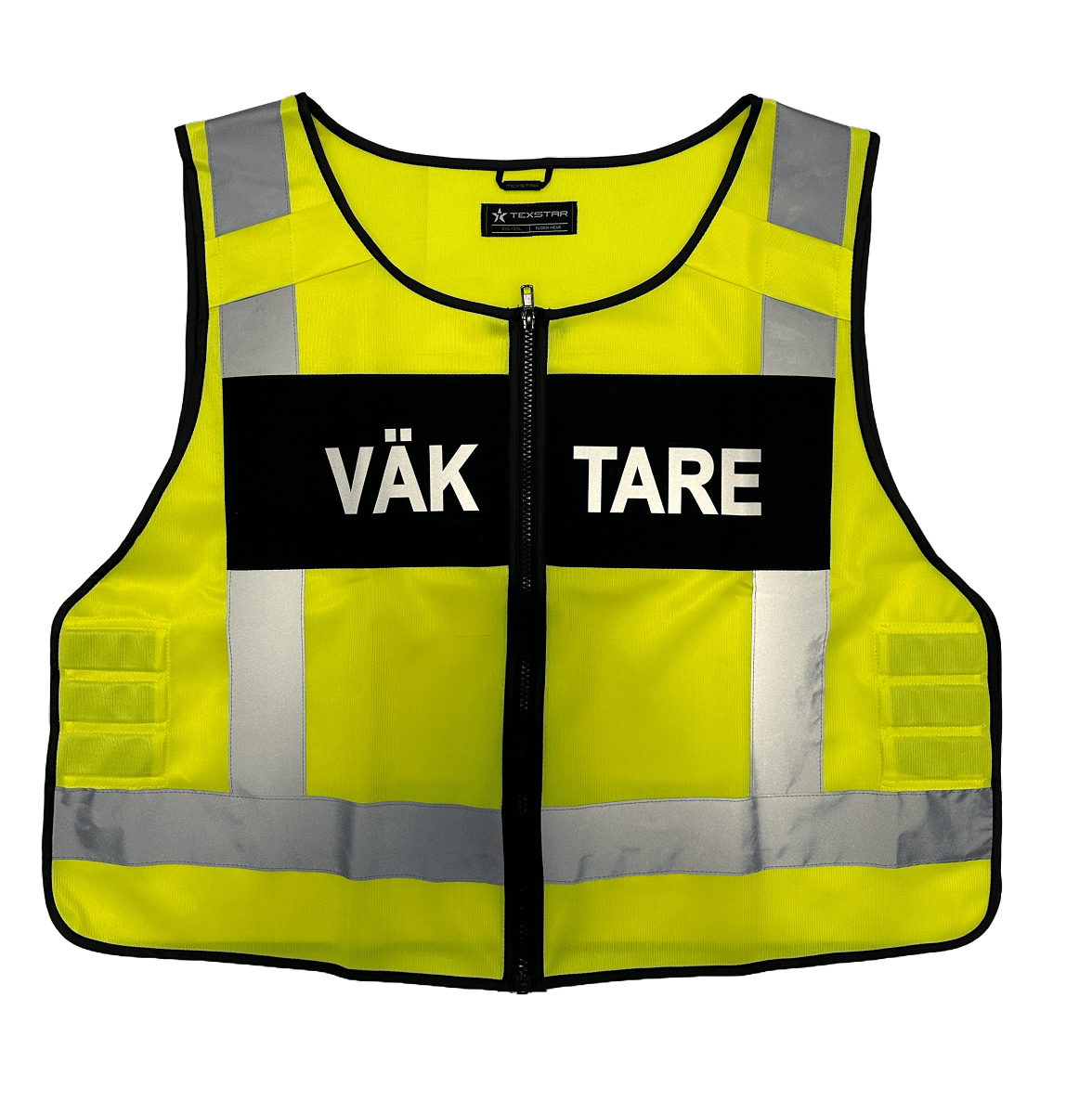 Gul slimmad varselväst för Väktare. Monofonhållare, svart platta med reflextryck VÄKTARE.