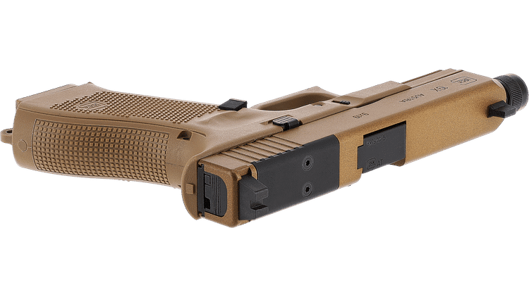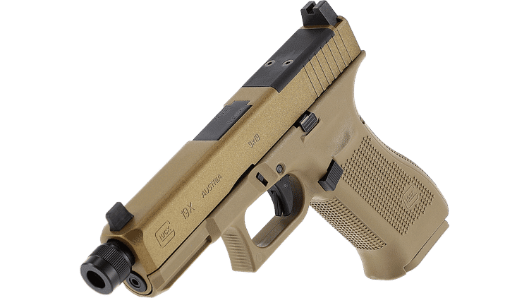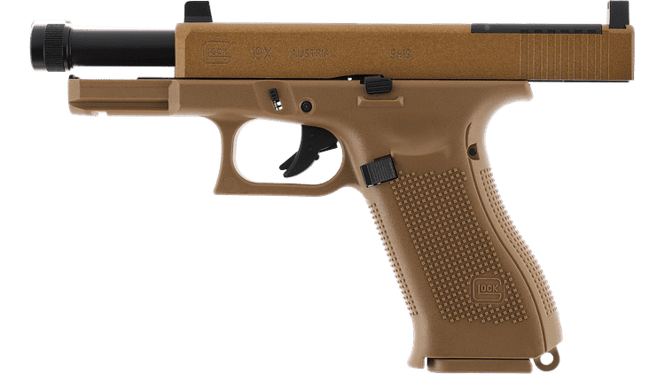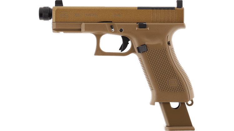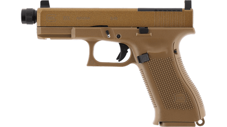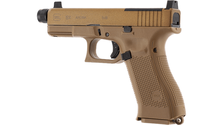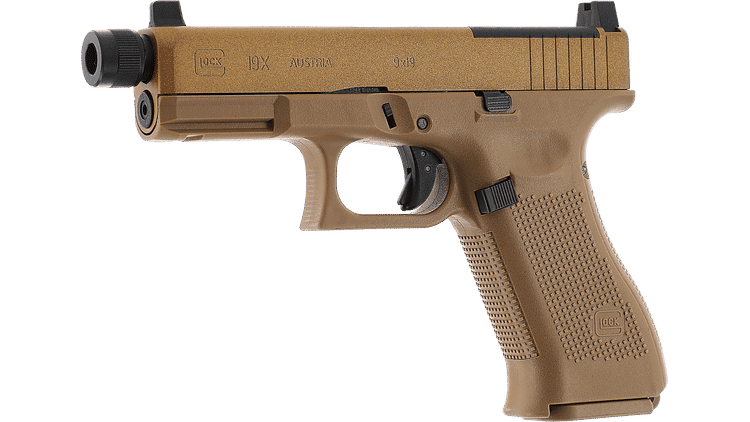 The GLOCK 19X MOS is a special version of the live-fire special edition. It was made exclusively on request for an American wholesaler, as the G19X is not available with MOS cut as standard. The G19X was also fitted with a muzzle thread (M14x1 left) to accommodate a suppressor. The high suppressor sights allow precise aiming even when the suppressor is fitted. The CO₂ airsoft version is also equipped with these features and thus offers the unique possibility of equipping the G19X with a point sight. The scope of delivery includes 4 adapter plates with the Docter, Trijicon, C-More and Leupold footprints. The frame also features the familiar lanyard loop that GLOCK uses on some models. The high-quality airsoft replica can also be realistically disassembled (field stripping), and the gas magazine available as an accessory offers the ambitious airsoft player yet another option.