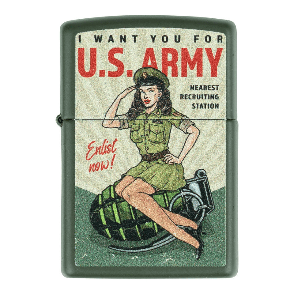 Inspired by classic American wartime enlistment posters. This Zippo combines military pride with iconic pin-up glamour. The illustration of the U.S. Army Enlist Pin-Up symbolizes charm, morale, and vintage Americana.