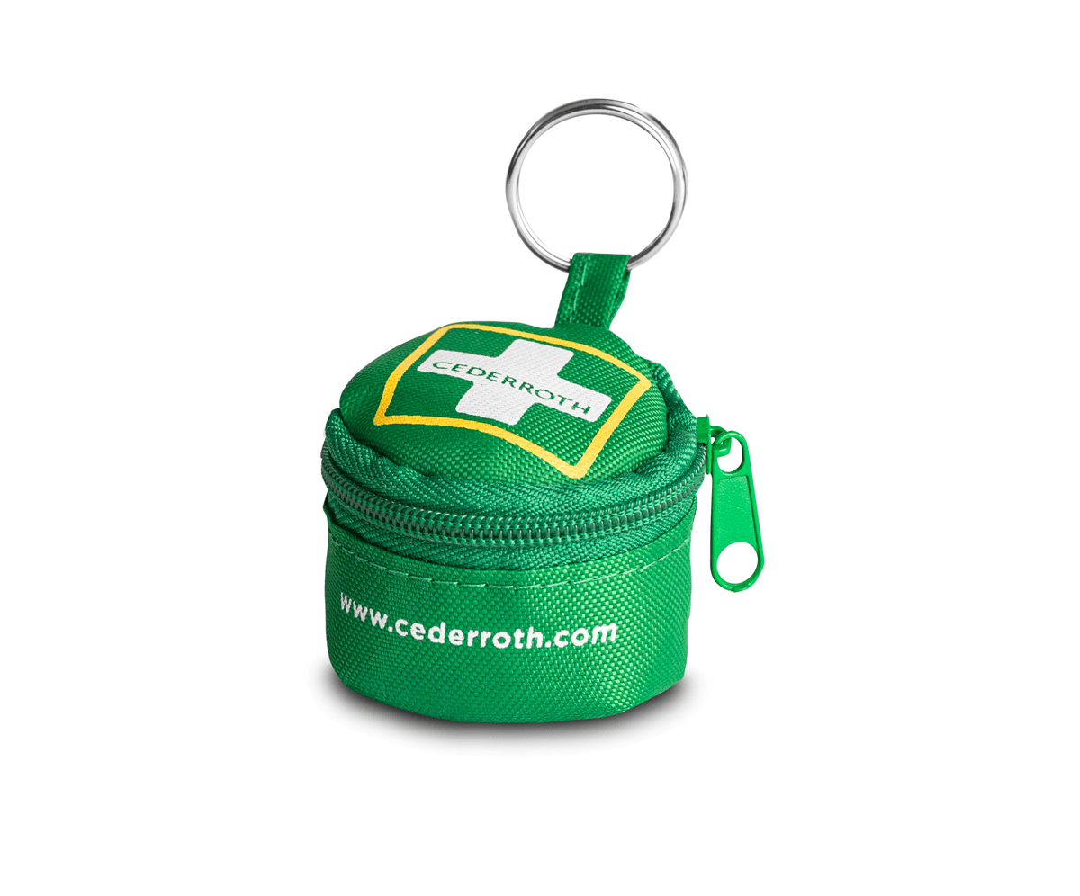 A breathing mask that consists of a one-way valve (green upper part, red lower part and a membrane) and a plastic sheet with graphic instructions printed on it. The Breathing mask is packed in a small pouch, which can be used as a key ring. The pouch is delivered in a plastic zip bag.