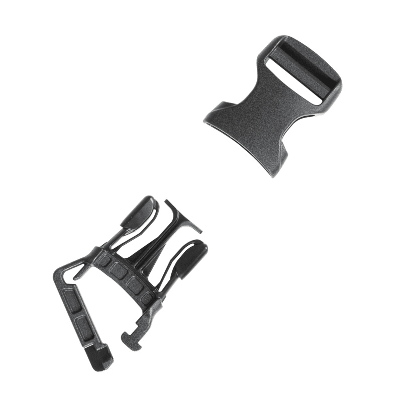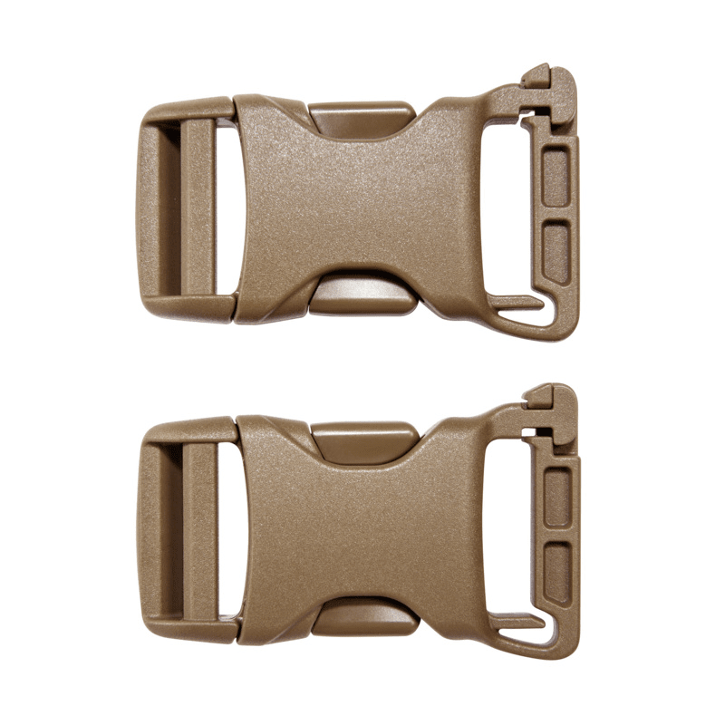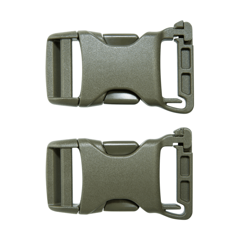 Strong, quick-release multipurpose buckles for vertical attachment to MOLLE systems and to the various gear loops.