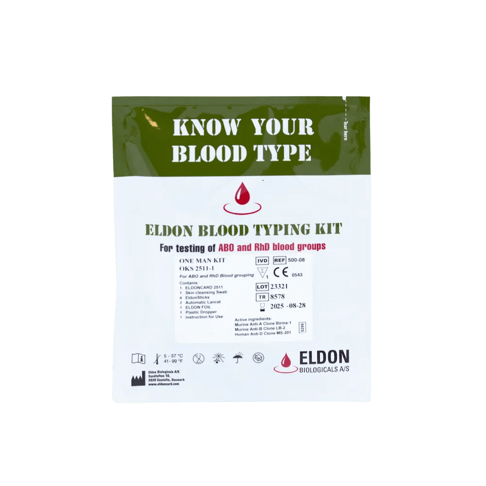 The Eldon One Man Kit is recommended for humanitarian interventions, emergency and rescue, donor recruitment, military medics, and other entities, who could benefit from conducting point-of-care blood type testing for instance in situations concerning accidents and injuries.