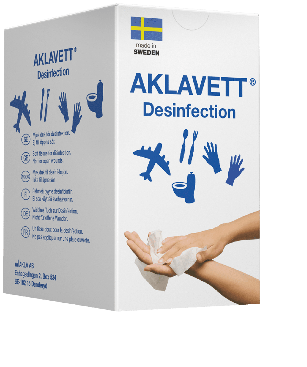 AKLAVETT ® is easy to take along everywhere. The soft nonwoven tissueis extra-large, 17 x 22 cm, which also makes it perfect to use for cleaning and disinfecting surfaces and objects such as toilet seats, handsets, toys, etc.