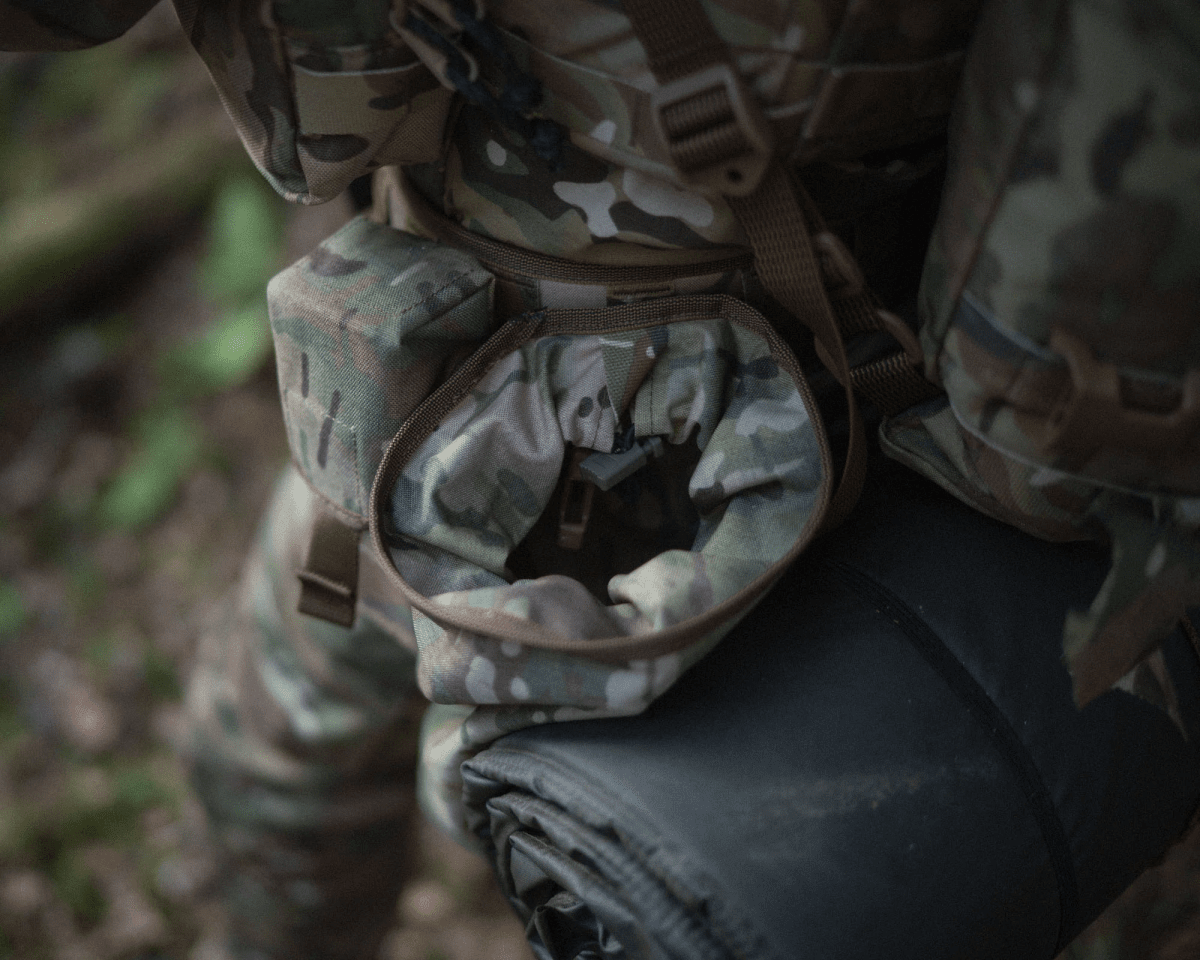 The rear features our standard PALS attachment webbing system with tuck tabs. The attachment straps can also be woven into belt loops for 45-50 mm wide belts.