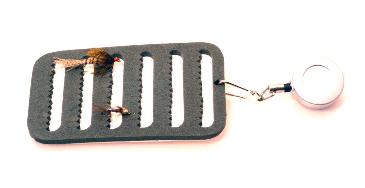 A. Jensen has made this clever pin-on reel with a foam board attached for your flies. This way, you can have your flies hanging on your vest or jacket, and if you want to change flies, it can be done without having to dig out the fly box.