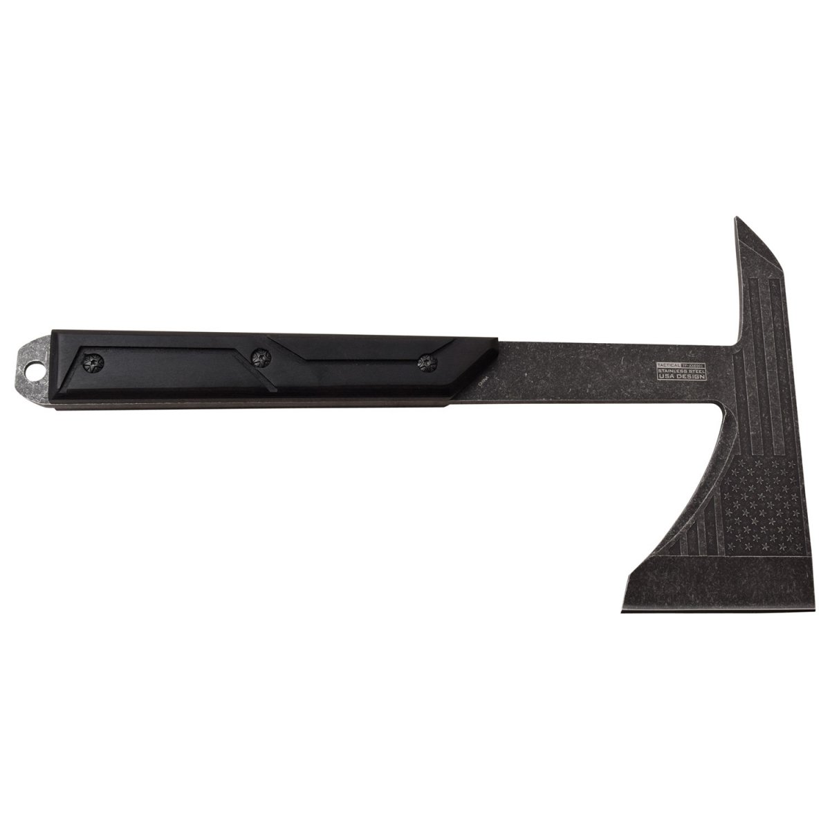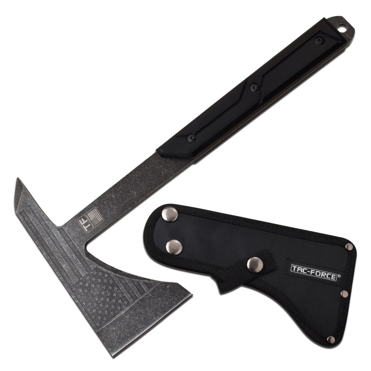 This 12" Tac Force USA single hand axe is great for target practice. Made with a full tang steel satin blade with embossed printed flag and black pakkawood handle.