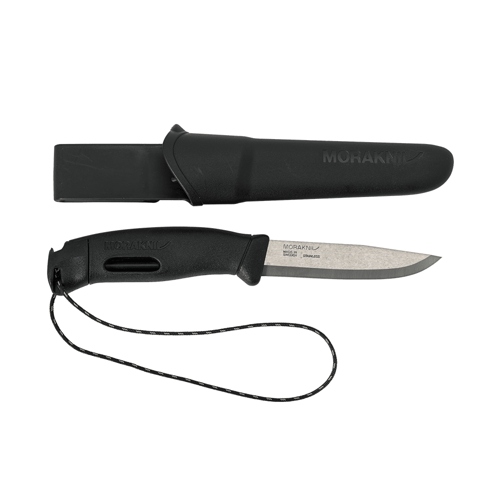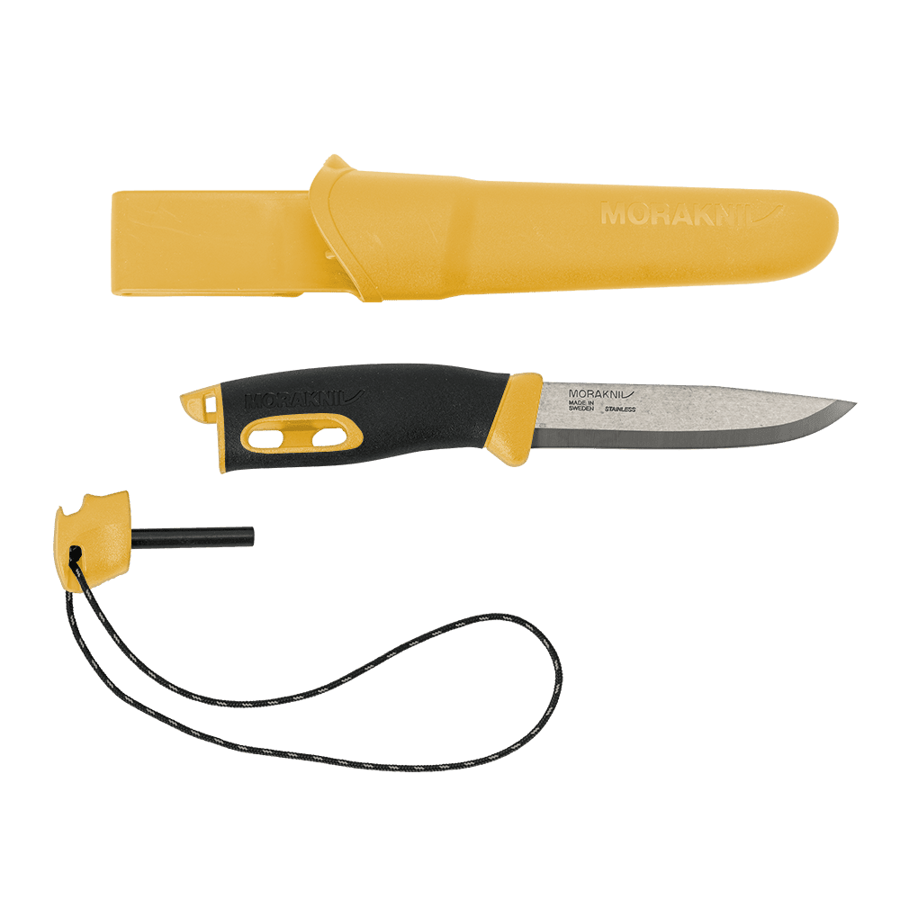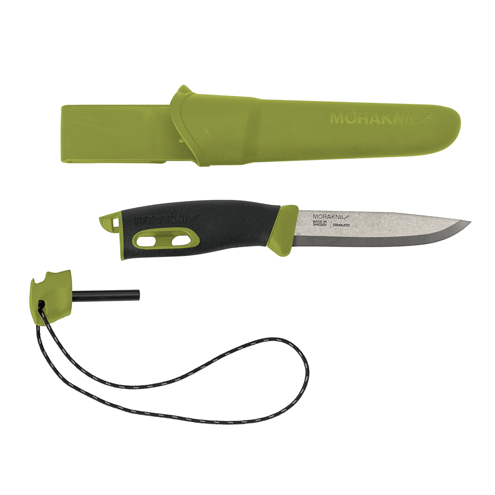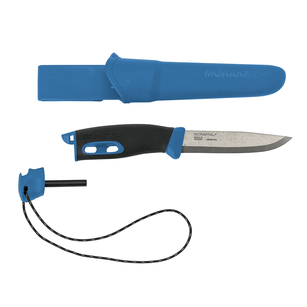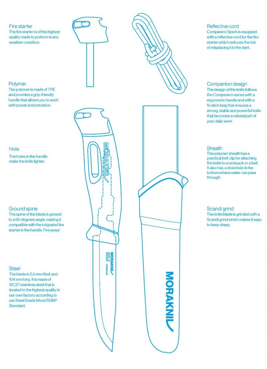 Knivslidan i polymer har ett praktiskt bältesclip så att kniven kan fästas på ryggsäcken eller i bältet. Companion Spark är dessutom utrustad med reflexparacord på tändstålet som minskar risken att förlägga tändstålet i mörker.