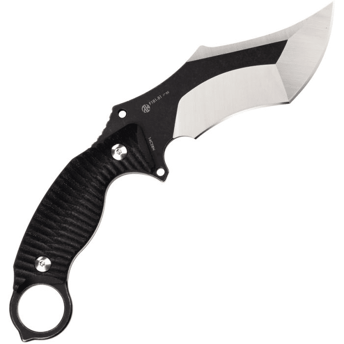 22.86 cm overall. 11.43 cm stonewash finish 14C28N Sandvik stainless blade. Black sculpted G10 handle.