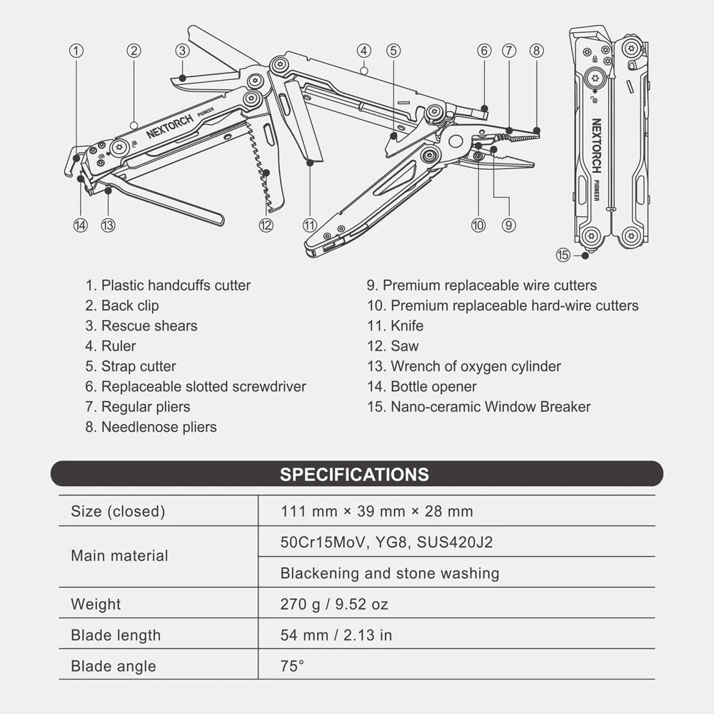 The PIONEER MT20 Multi-Tool with Glass Breaking Tip redefines first responder readiness by combining professional-grade rescue shears with 14 additional mission-critical tools. Built around replaceable premium wire cutters and full-size trauma shears, this purpose-built platform delivers when seconds count. The MT20's heavy-duty construction and specialized rescue features like the oxygen tank wrench and handcuff cutter make it essential gear for EMS, fire, and tactical operators. The spring-loaded shear design reduces fatigue during extended use, while the 50Cr15MoV stainless steel blade stands ready for any cutting task.