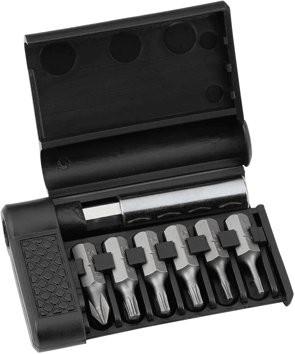 Bit set for Fallkniven knives with 6 different bits including a magnetic bit holder. The box itself can also be used as a handle by attaching the bit holder to the box. See photo.