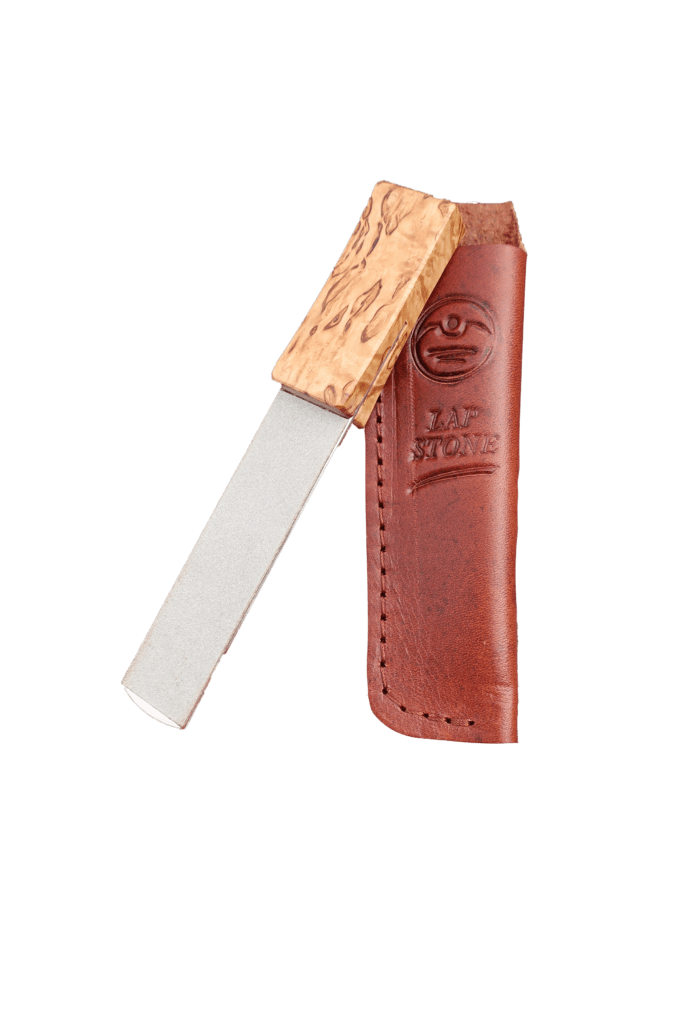 Even though this beautiful and well liked sharpener is a popular gift, it should not be misstaken for a thing of beauty that shouldn’t be used. The wooden handle can endure both sun and rain and the genuine leather sheath holds the sharpener firmly in place while hanging from your belt. It has a fine and coarse side with 75×20 mm diamond surface each (30 micron/60 micron front/back corresponding to 300/600 grit).