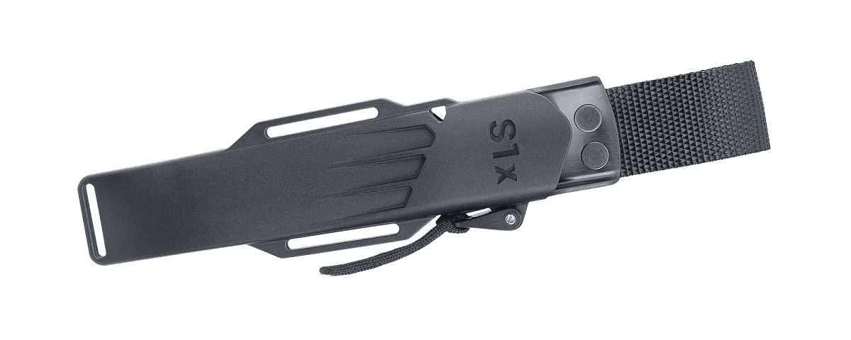 In our usual way, we have put a lot of energy into designing a safe knife sheath, which is actually where the knife will spend most of its time. The design of the sheath determines the access to the knife, and here we have really put all our efforts in order to get a safe sheath that allows easy access to the knife. The sheath has both a transport lock (the folding bracket with a strap) and a working safety detail that allows the knife to be in place until you decide to use it. It is a bit a belt-and-braces approach, but we like putting safety first – a lost knife is of no use. The transport lock will therefore allow the knife to be fastened tip-up or tip-down on the body or on your equipment without any risk.