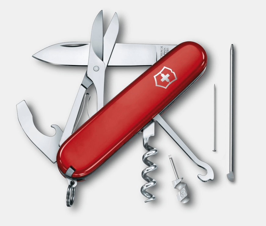 | Tools | Blade, large / Corkscrew / Mini screwdriver 1.5 mm / Bottle opener | Can opener | Screwdriver 5 mm | Wire stripper / Scissors / Multipurpose hook | Nail file / Key ring / Pin / Tweezers / Toothpick / Pressurized ballpoint pen / Bottle opener / Multipurpose hook |