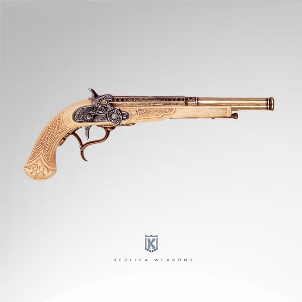 Spectacular replica of a pirate percussion pistol — a decorative piece crafted by Kolser that takes us back to the era of naval battles and high-seas confrontations. It also recalls one of the most widely used weapons across the colonies.