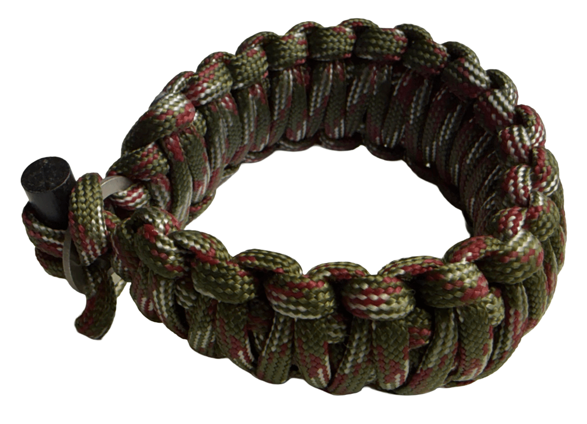 Robust paracord bracelet with a small knife blade that functions as a buckle to adjust the size. The locking pin used for adjustment is a ferro rod, making the bracelet a practical addition to your outdoor or survival gear. The bracelet is braided from durable paracord and combines functionality with a rugged, stylish look.