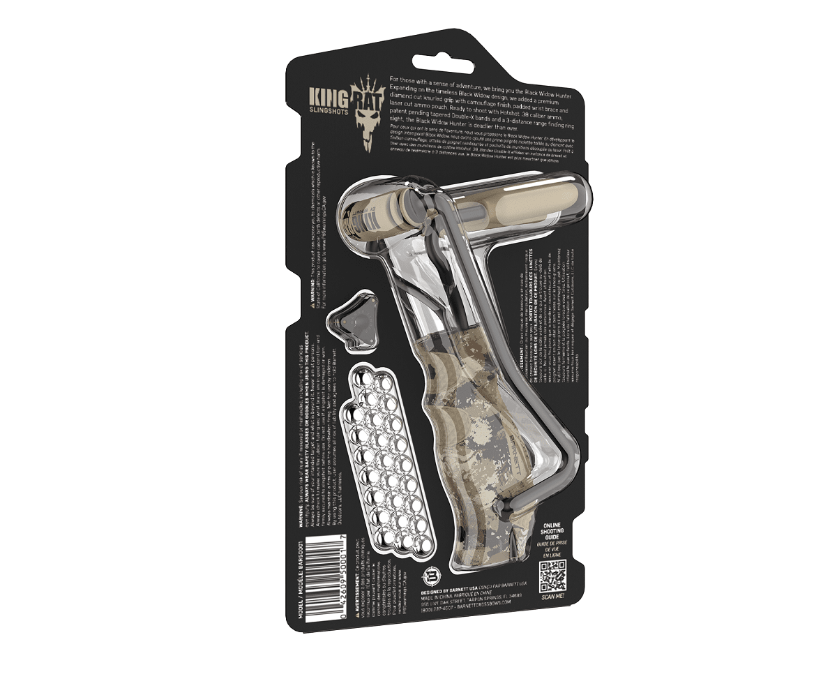 Expanding on the timeless Black Widow design, we added a premium diamond cut knurled grip with a camouflage finish, padded wrist brace, and laser cut ammo pouch. Ready to shoot with Hotshot .38 caliber ammo, patent-pending tapered Double-X bands, and a 3-distance, range-finding ring sight, the Black Widow Hunter is deadlier than ever.