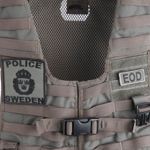 A grey and black patch with the text POLICE SWEDEN and a Police symbol.