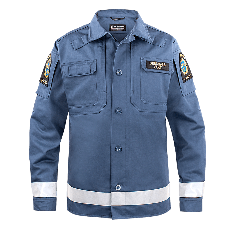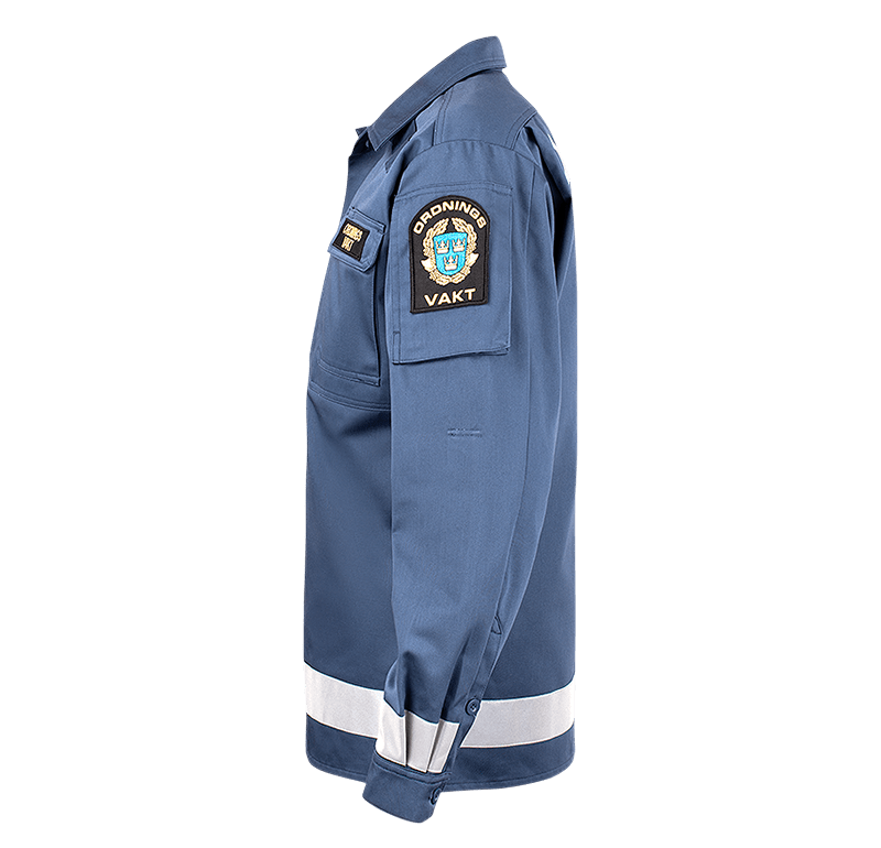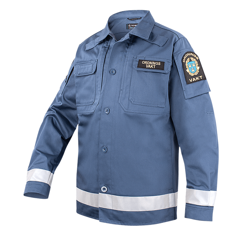 Skjortjacka med två stora bröstfickor med dragkedjor integrerat i okets framparti. Tillverkad i samma slitstarka material som ordningsvaktsbyxorna OP01 och OP02.