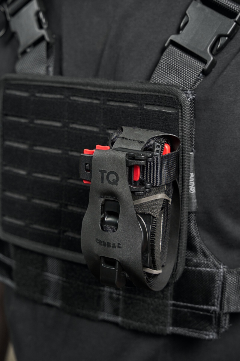 Holder for the X8T one-handed tourniquet with quick-release attachment.