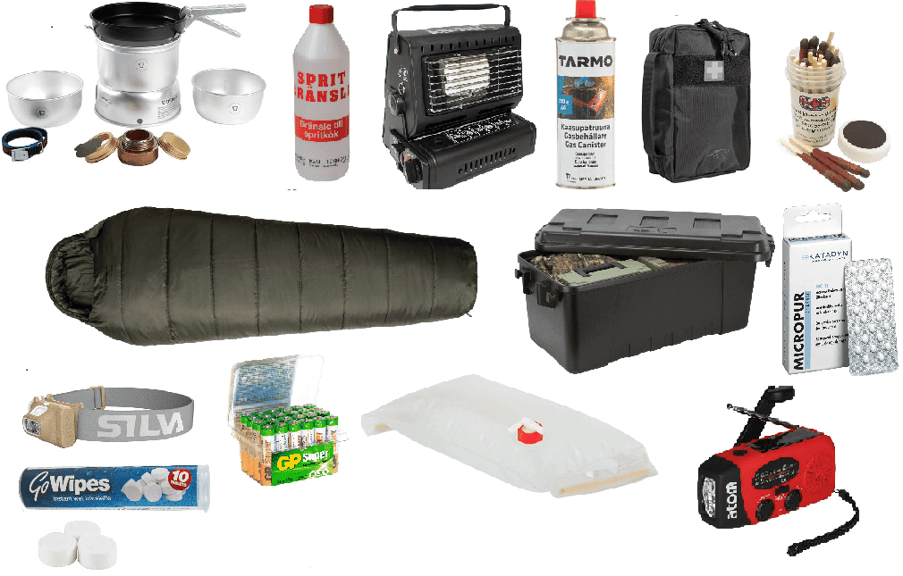 Krislådan innehåller Dynamo ficklampa med FM radio, Pannlampa med extra batterier, Stormkök med bränsle, Vattendunk som rymmer 5L vatten, Vattenreningstabletter (kan rena 70 L vatten), Tändstickor, Gasolvärmare med gas, Sovsäck som klarar temperaturer ner till -12°c grader, Sjukvårdsmaterial (för upp till 4 personer) och Handdukstabletter (10st).