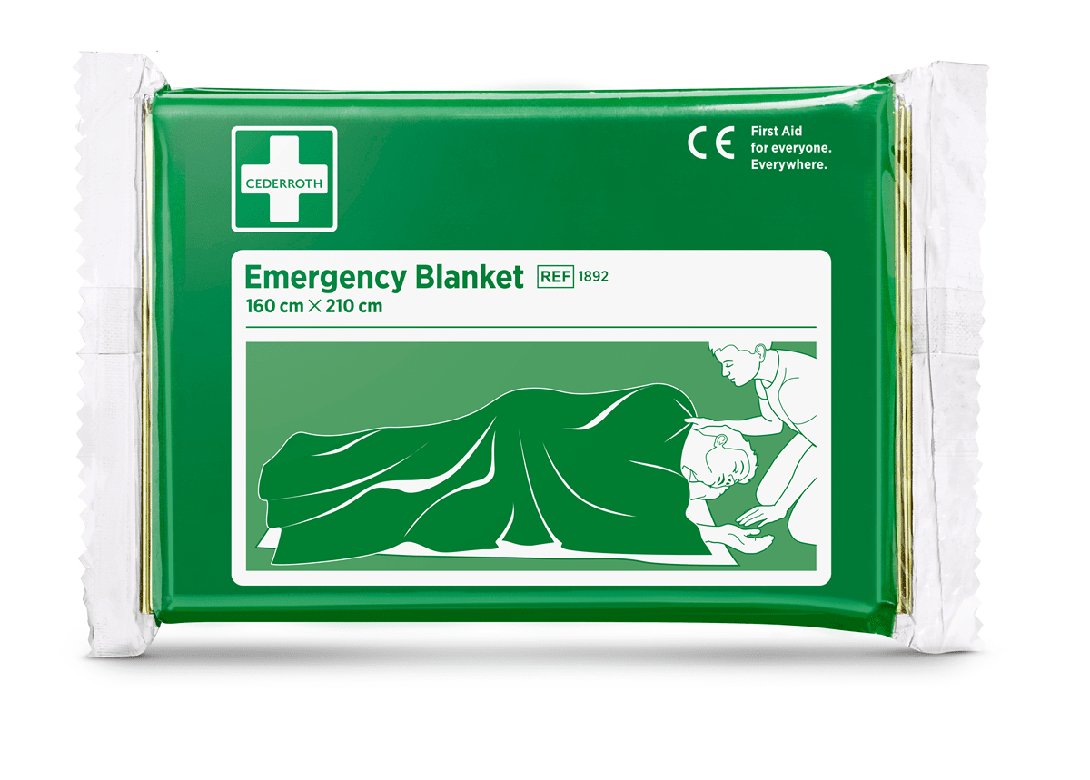 An aluminum coated plastic film packed in a plastic package with printed illustrations. Gold colored on one side, silver on the other. The blanket helps prevent hypothermia, assist in prevention of post-accident shock and protects the injured from wind and moist. The Emergency Blanket is intended for use in a first aid situation.