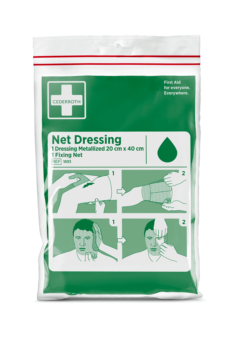 A large sterile metallized dressing and a latex-free tubular net intended for keeping the dressing in place. A non-adherent layer on both sides of the dressing prevents the dressing from sticking to the wound.