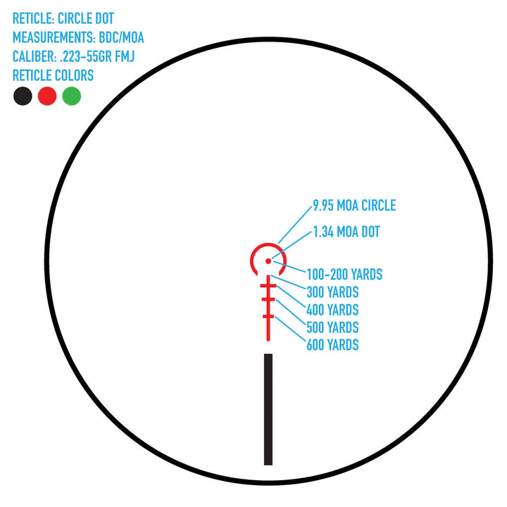 The RapidStrike’s circle dot reticle offers red, green, or black illumination across five brightness settings, powered by a CR2032 battery with a 100-hour lifespan. Pop-up locking turrets are resettable and tactile, with half-MOA clicks for quick zeroing. The optic is IP67 waterproof, nitrogen-purged, shockproof, and fog resistant, built from durable aluminium in a matte black finish.