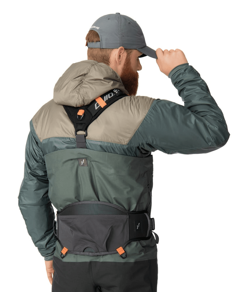 Med en något annorlunda form för att passa och fungera bra som stödbälte. Vi har också gett det två D-ringar baktill och två öglor vid höfterna för att fästa saker. Bra möjlighet att hitta sin egen punkt för att fästa vadarstaven. På baksidan av bältet finns en Spandex-ficka.