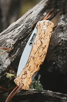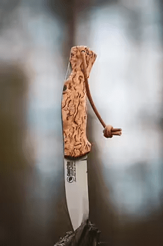 Bladet är tillverkat i starkt rostfritt stål och har en skandinavisk slipning som gör kniven lätt att tälja med och gör det enkelt att slipa kniven med rätt vinkel. Skaftet är tillverkat i utvald masurbjörk med mycket skönt grepp.