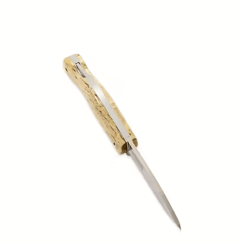 - Blad av det rostfria stålet 14C28N från svenska Sandvik, som efter en specialhärdning med djupkylning håller skärpan mycket bra