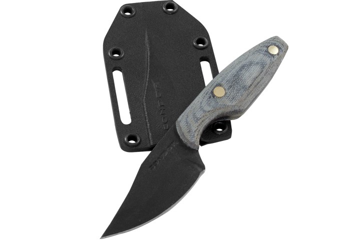 Robust neckknife med svärtat bowieblad i kolstål och handtag i micarta. Levereras med slida i kydex.