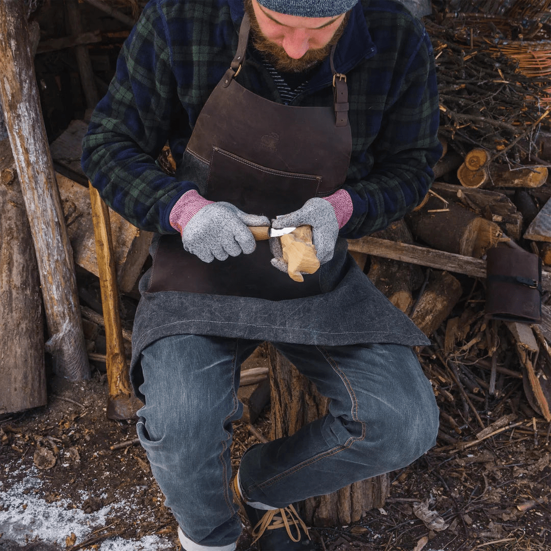 Funktionella fickor gjorda av äkta läder är fixerade med dekorativa metallnitar och låter dig ha alla prylar och verktyg som behövs för arbetet med dig. Kontrasterande, dekorativa sömmar framhäver detaljerna på carvingförklädet. Bekväma korsband kan justeras efter höjd och individuella kroppsstorlekar, vilket gör att förklädet passar alla.