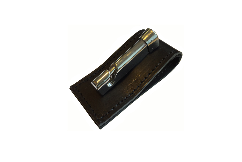 Klassisk bälteshållare i svart läder och kromad metall för gummibatongen. Du kan lätt osäkra batongen vid behov genom att öppna låsmekaniken.
