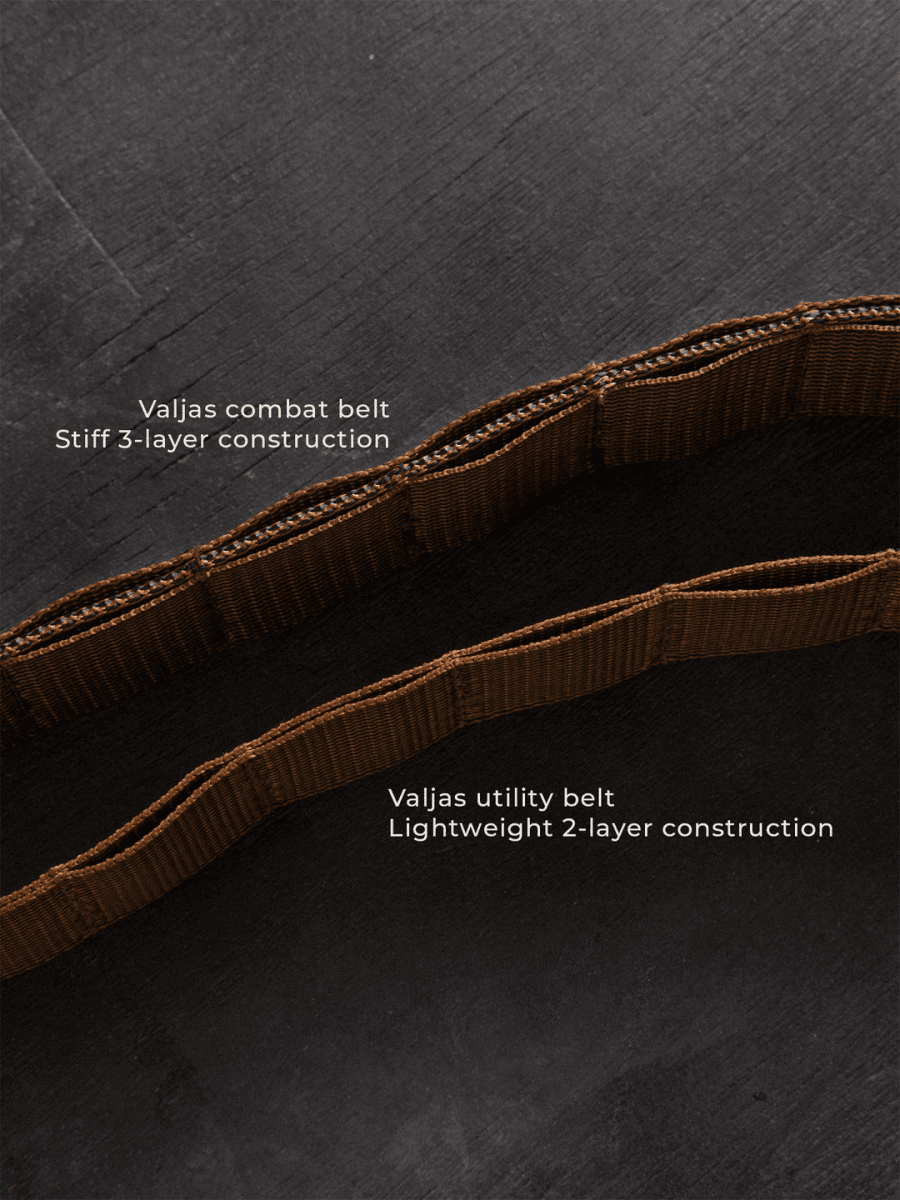 The body of the belt is double layered webbing, bartacked together to form PALS compatible channels for pouch attachment. There are no stiffening layers or such going on here, just two layers of regular webbing.