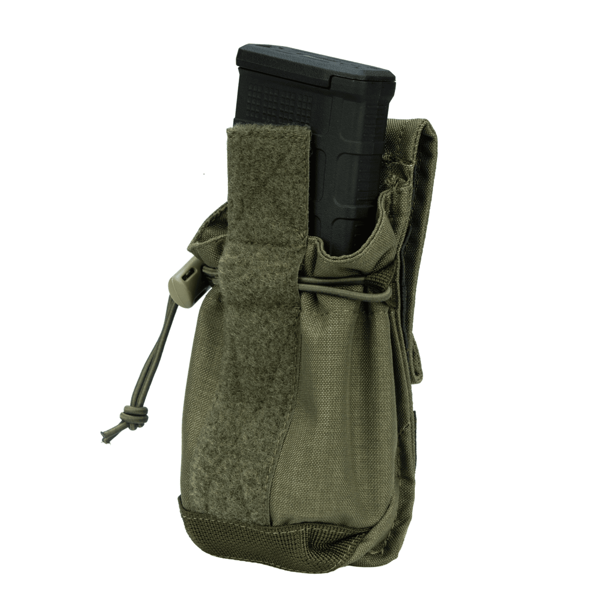 För optimal passform finns ett justerbart snörsystem som håller magasinen säkert på plats, oavsett om du använder ett eller två. På baksidan sitter en MOLLE-panel som gör det enkelt att montera fickan på stridsutrustning, kroppsskydd eller annan kompatibel utrustning.